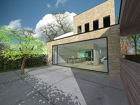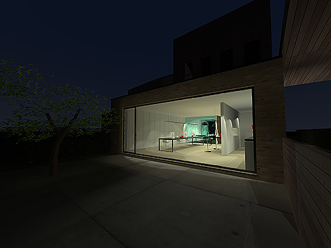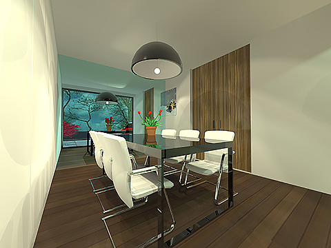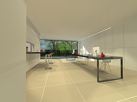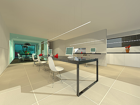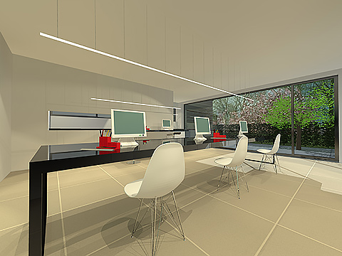 Op het gelijkvloers werd er voor geopteerd om de vergaderzaal te voorzien aan de straatzijde, op deze manier fungeert deze als uithangbord van de praktijk. De grote vergaderzaal is opdeelbaar in 2 kleinere vergaderzalen d.m.v. een mobiele wand. Achter de vergaderzalen is een landschapskantoor voorzien met open indeling. Deze ruimte geeft uit op de achterliggende tuin. Tegen de linkerzijgevel is tevens een kleine kitchenette voor de kantoorruimte voorzien. Op de verdieping werd een praktisch appartement ingericht.