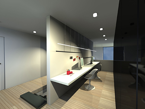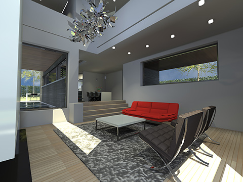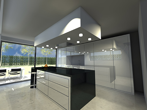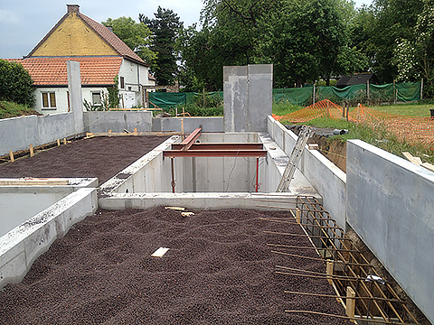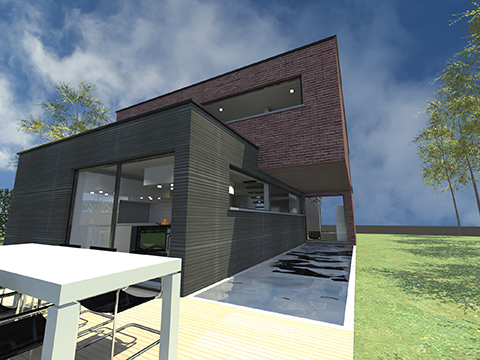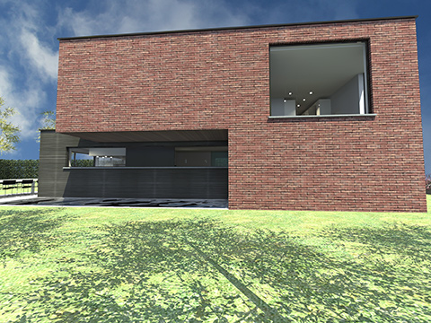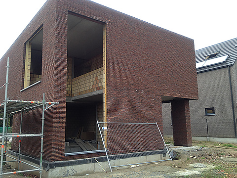 Bij deze woning werd gespeeld met 2 volumes die in elkaar grijpen en zo een kubistisch geheel vormen. Door toevoeging van een waterstrook die doorloopt onder de oversteek van de verdieping werd er extra cachet aan de woning toegevoegd. In het interieur werd gespeeld met niveaus, zo bevindt de zithoek zich in een 'zitput' die lager ligt dan de keuken en de eethoek, bovendien bevindt zich boven deze zitruimte een open vide die het gelijkvloers met de verdieping visueel verbindt. Het geheel resulteert in een zeer open en ruimtelijke woning met verschillende doorzichten.
