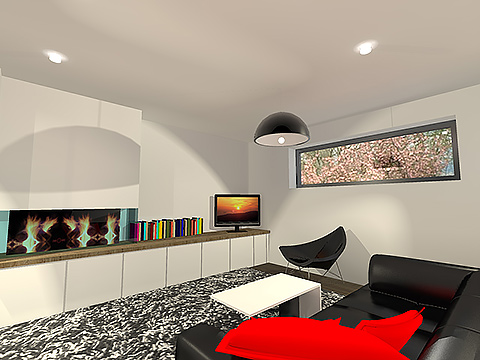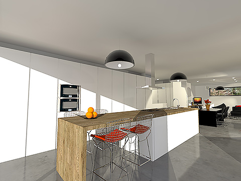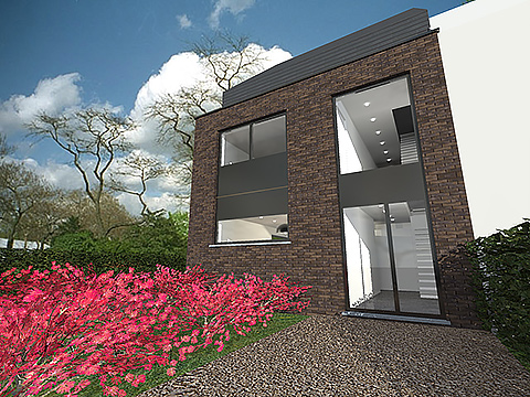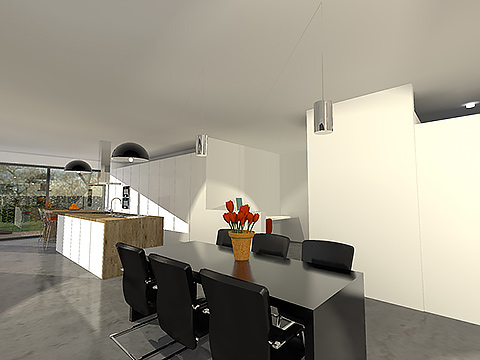Deze halfopen woning werd op het gelijkvloers in 2 gedeeld. Links, tegen de vrijstaande gevel werd 1 open leefruimte gevormd met achtereenvolgens zithoek, eethoek en keuken, rechts werden enkele gesloten ruimtes (inkom, bureau, berging) achter elkaar geschakeld in een kastprincipe. Dit levert een praktisch en open geheel op. Deze eenvoudige structuur werd op de eerste verdieping doorgetrokken, in het linker gedeelte werden de slaapkamers voorzien, in het rechter gedeelte de traphal en badkamer.