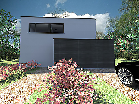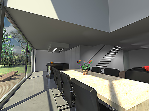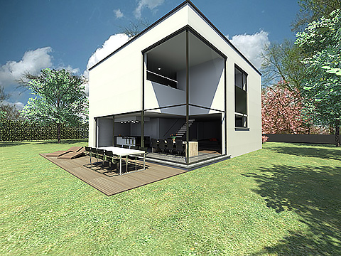 Omwille van het prachtige zicht grenzend aan de tuin, werd de achtergevel van de woning volledig open getrokken. Vooraan werd de woning daarentegen vrij gesloten gehouden, omwille van de ligging aan een steenweg. Om het geheel een moderne uitstraling te geven, werd de voorgevel en rechter zijgevel ontdubbeld, de 'losgekomen' wand werd geaccentueerd door deze te bekleden met een lamellenstructuur. In de woning werd de grote raampartij op de achtergevel geaccentueerd door een vide, die tevens de home office (gelegen op de verdieping) visueel verbindt met de zithoek en keuken (op het gelijkvloers). Op het gelijkvloers werd de keuken aan de achtergevel voorzien, om zo te kunnen genieten van het mooie zicht (en licht) van de tuin, de zithoek werd meer vooraan in de woning voorzien, op die manier wordt er een knusse TV hoek gecreëerd.