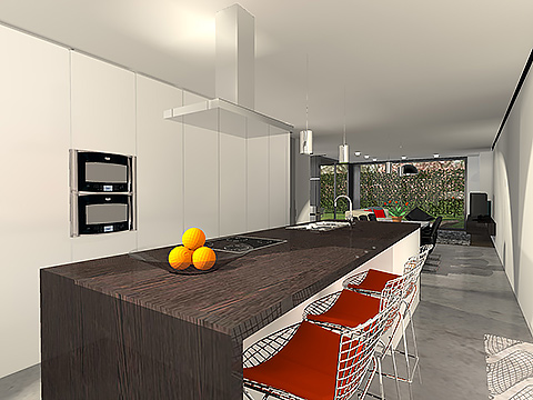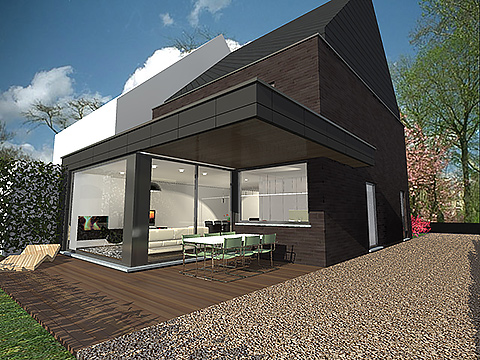 Aan deze woning werd extra karakter gegeven door de achterbouw met bijhorende luifel te voorzien in trespa en op die manier te contrasteren met het hoofdvolume. Op het gelijkvloers werd een ruime open zithoek gecreëerd, met aanpalende eethoek. De home office zit achter de hoek en heeft rechtstreeks contact met de leefruimtes. Op de verdieping werd gestreefd naar een praktische en compacte indeling van de slaapkamers en badkamer.