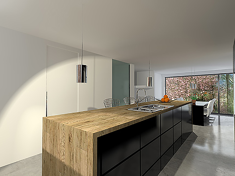 De keuken werd opener en ruimtelijker gemaakt door de wand tussen eethoek en keuken weg te halen. De keuken kreeg een moderne look door hier een kookeiland toe te passen. De traphal en badkamer werden gerestyled door hier de bevloering te vervangen door een moderne PU vloer. De badkamer werd tevens volledig herschikt en heringericht.