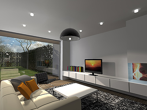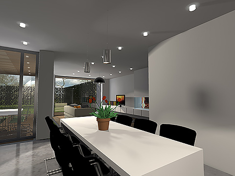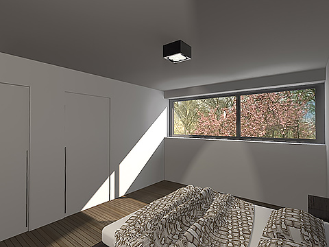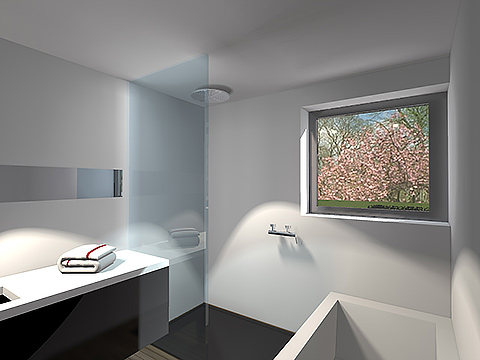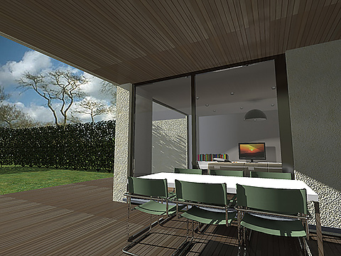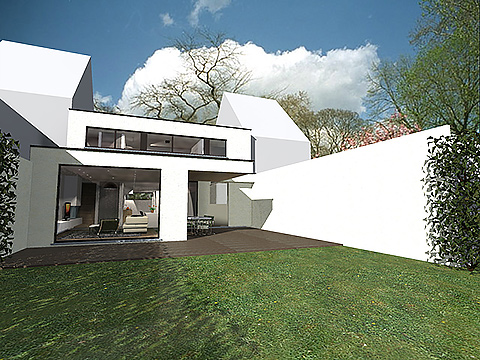 De voorgevel werd bewust zeer strak en sober gehouden, om storende geluid en inkijk te voorkomen. De achtergevel, daarentegen, werd zoveel mogelijk beglaasd. In het interieur werd gezocht naar een indeling waarbij de ruimtes in elkaar overvloeien, maar waarbij elke ruimte toch zijn eigen karakter en sfeer meekrijgt. Op de bovenverdieping werd gespeeld met de flexibiliteit van de woning, zo kunnen de kinderkamers omgevormd worden tot een bureauruimte, een wasruimte met dressing of een polyvalente kamer.