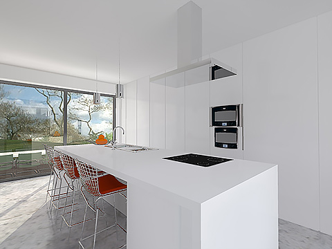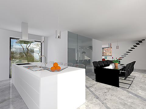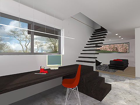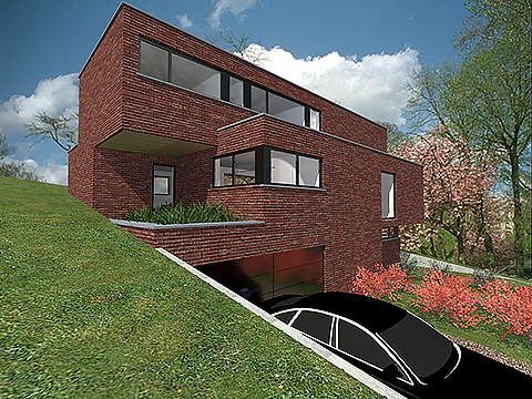 De helling van het terrein en de strenge bouwvoorschriften vormde een uitdaging, er werd aldus gezocht naar een speelse manier om hier mee om te gaan, dit resulteerde in een spel met verschillende kubistische volumes in de gevel. Bij de indeling van de ruimtes werd gestreefd naar een zo open mogelijk karakter van de woning. Op de verdieping werd binnen het beperkte volume gezocht naar een maximale optimalisatie van de ruimtes.