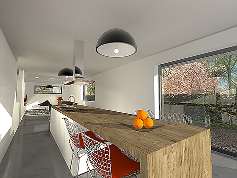 Deze halfopen woning werd op het gelijkvloers in 2 gedeeld. Links, tegen de vrijstaande gevel werd 1 open leefruimte gevormd met achtereenvolgens zithoek, eethoek en keuken, rechts werden enkele gesloten ruimtes (inkom, bureau, berging) achter elkaar geschakeld in een kastprincipe. Dit levert een praktisch en open geheel op. Deze eenvoudige structuur werd op de eerste verdieping doorgetrokken, in het linker gedeelte werden de slaapkamers voorzien, in het rechter gedeelte de traphal en badkamer.