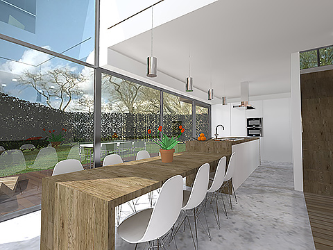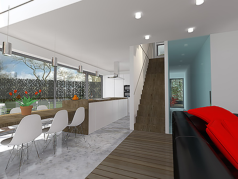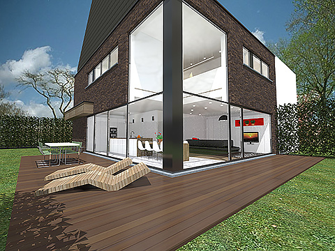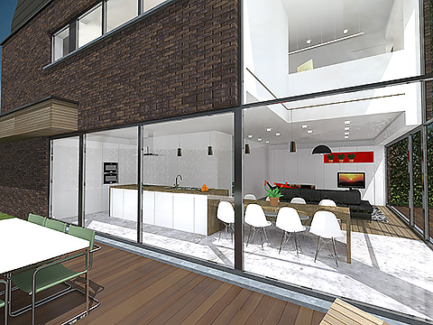 Aangezien het mooiste gedeelte van de tuin langs de rechter zijgevel gelegen was, werd deze gevel volledig beglaasd. Hierlangs werd het hart van de woning (de leefkeuken) gesitueerd. De zithoek en eethoek werden dieper in de woning, langs de achtergevel voorzien. Op de verdieping werd de nachthal via een vide gekoppeld aan de beneden verdieping. In het interieur werd gewerkt met houtaccenten om het geheel wat warmer te maken.
