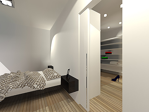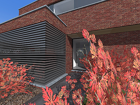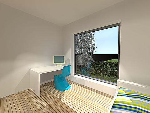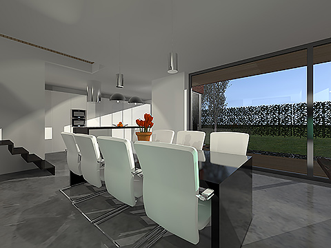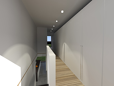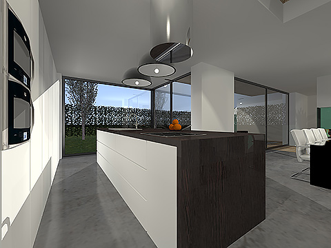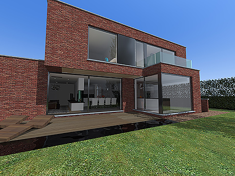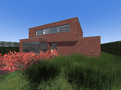 De ruimtes en volumes werden dermate geschikt dat er in de gevel een spel van lijnen en vlakken ontstaat. De voorgevel kreeg extra cachet door het toepassen van een lamellenwand. Op het gelijkvloers werd de nadruk gelegd op het weidse uitzicht achteraan, hier werden dan ook grote raampartijen voorzien. Alle leefruimtes (zithoek, eethoek, keuken) zijn met visueel verbonden en vormen toch elk op zich een aparte entiteiten, op die manier wordt het spel van lijnen en vlakken doorgetrokken in het interieur. Op de bovenverdieping werd er naar gestreefd om de strakke indeling te behouden. Het energiebewuste en duurzame aspect werd ook hier niet uit het oog verloren, door het toepassen van enkele duurzame technieken, doorgedreven isolatie en luchtdichtheid haalt deze woning een zeer mooi E-peil.