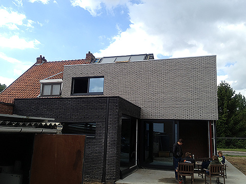 Op het gelijkvloers werd er meer licht, lucht en ruimte gecreëerd door de open leefkeuken met zithoek. Om de gezelligheid van de zithoek te benadrukken, werd deze apart geplaatst achter een wand met een doorkijkhaard. Op de verdieping werden in het nieuwe volume 2 slaapkamers toegevoegd. In de gevel werd de nadruk gelegd op het verschil tussen bestaand en nieuw. Aan de zijgevel werd tevens een carport toegevoegd, die de woning een moderne look geeft.