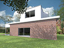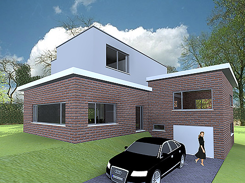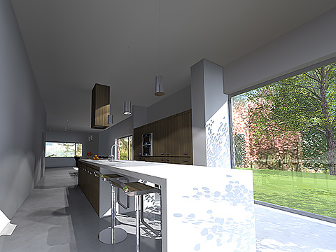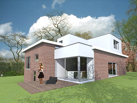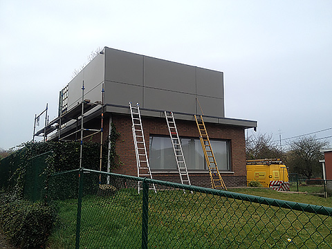 Er werd bovenop het bestaande gebouw een nieuw volume gecreëerd, hierin werden 2 extra slaapkamers voorzien. Het nieuwe volume werd opgericht in kubistische stijl, en sluit daardoor in vorm aan bij de bestaande woning, het materiaalgebruik zorgt echter voor het nodige contrast. In 1 beweging werd de keuken binnen het bestaande volume herbekeken. De keuken werd opgevat als een open geheel met een wijds zicht op de tuin.